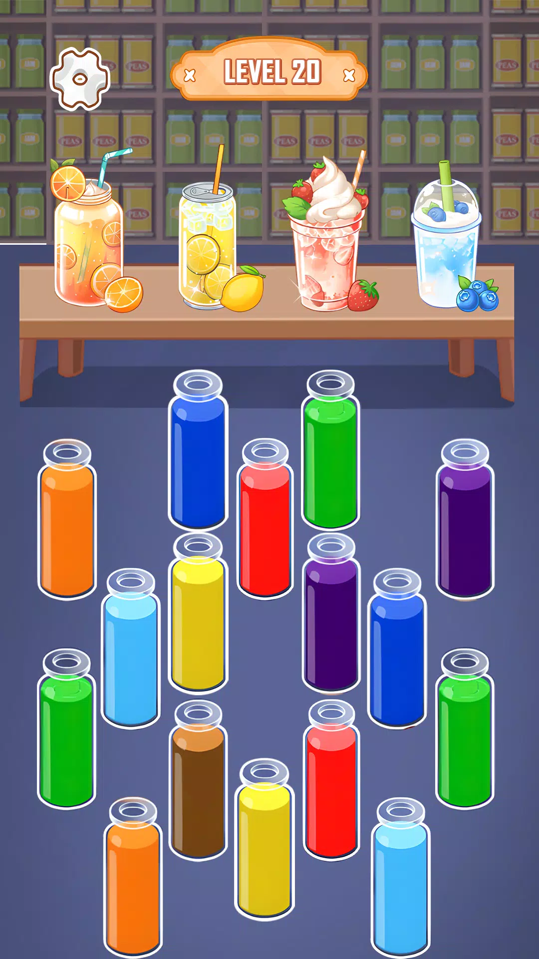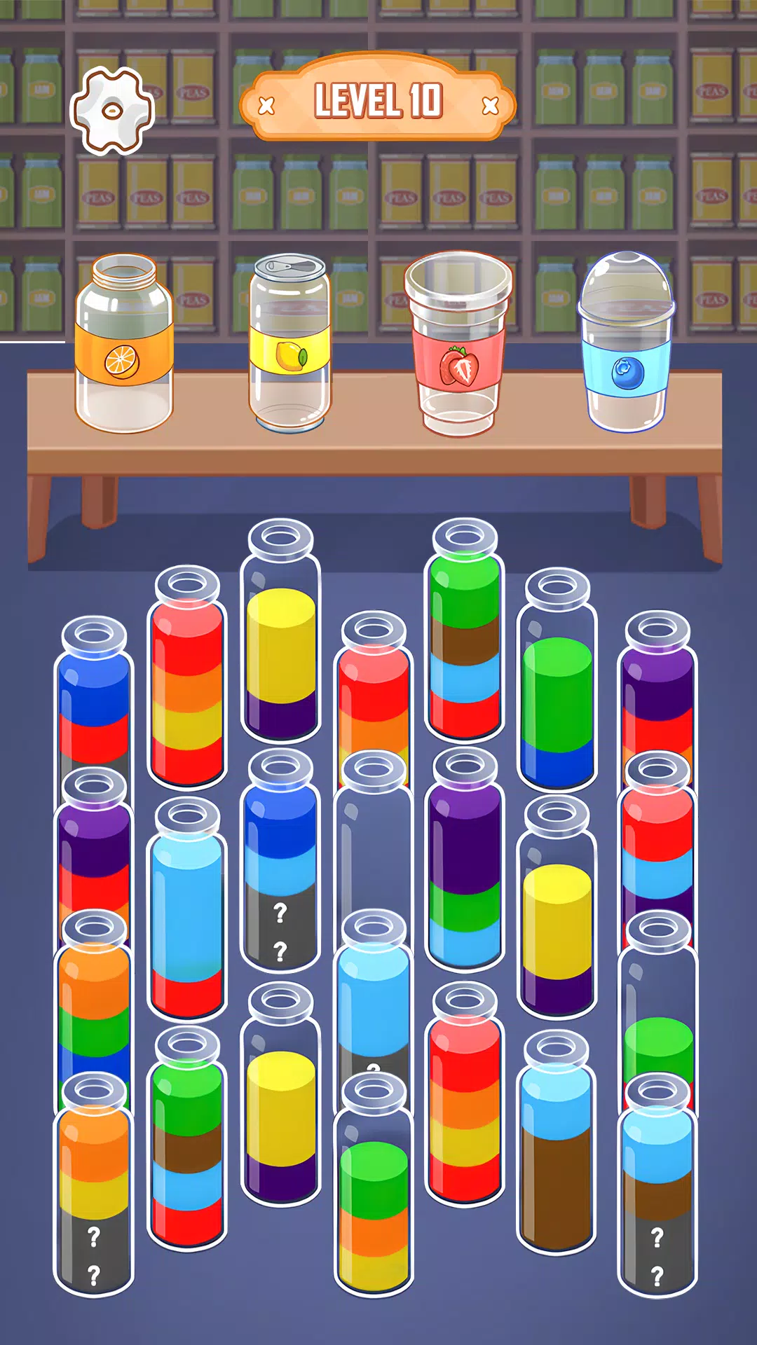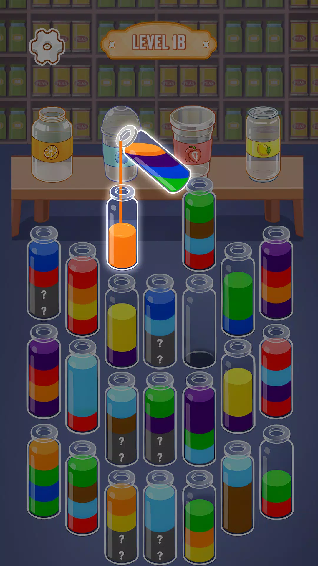 - Один цвет на ёмкость: цель каждого уровня.