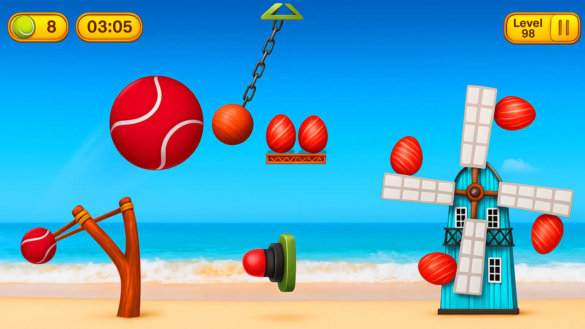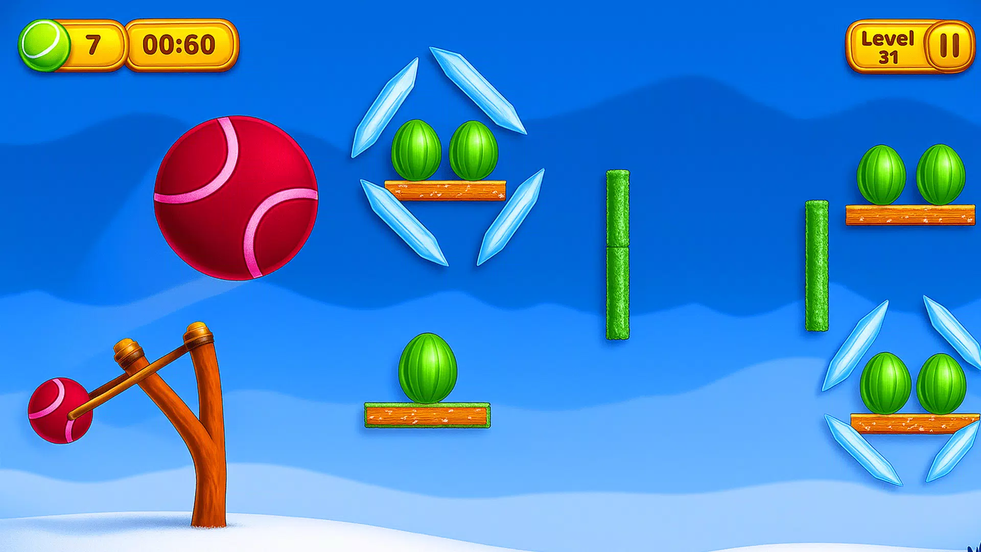- Система улучшений: зарабатывайте монеты для разблокировки новых рогаток и мощных снарядов.