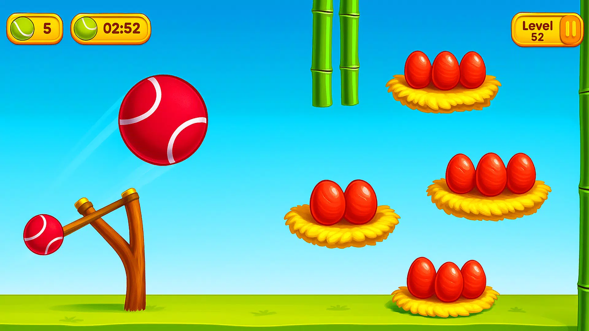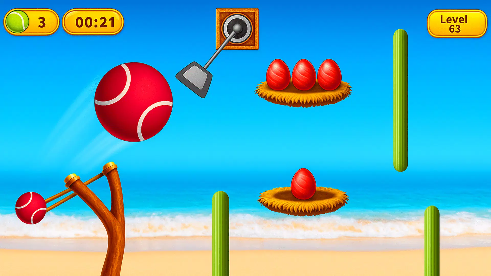 Каждый уровень — это новое испытание вашей точности. Яйца расположены на различных расстояниях и высотах, некоторые движутся, создавая дополнительную сложность. Рассчитывайте траекторию полёта снаряда, учитывайте физику и совершенствуйте тайминг для идеальных выстрелов. Система бонусов награждает за точность и скорость, мотивируя улучшать результаты.
