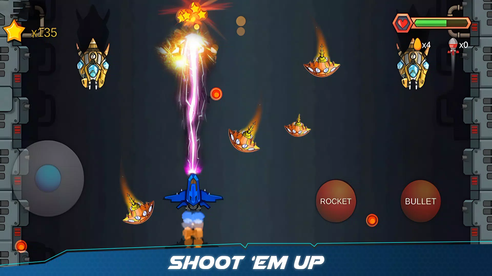 Alien Invasion: Space Shooter — это динамичная аркадная стрелялка, где вы противостоите вторжению инопланетной армии Зорга в галактику. Управляйте самолётом, улучшайте оружие и щиты, выживайте в бесконечных космических сражениях против всё более сильных врагов. Под руководством генерала выполняйте сюжетные миссии, используйте магазин для разблокировки улучшений и доминируйте в небе в этой эпической войне за спасение Земли.