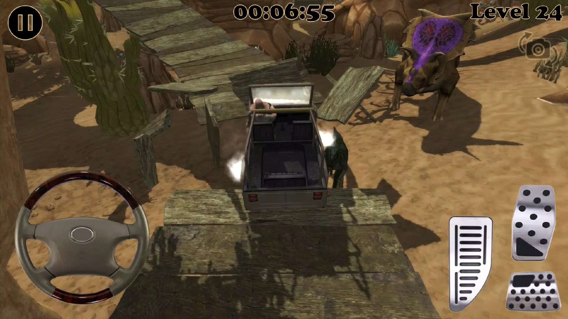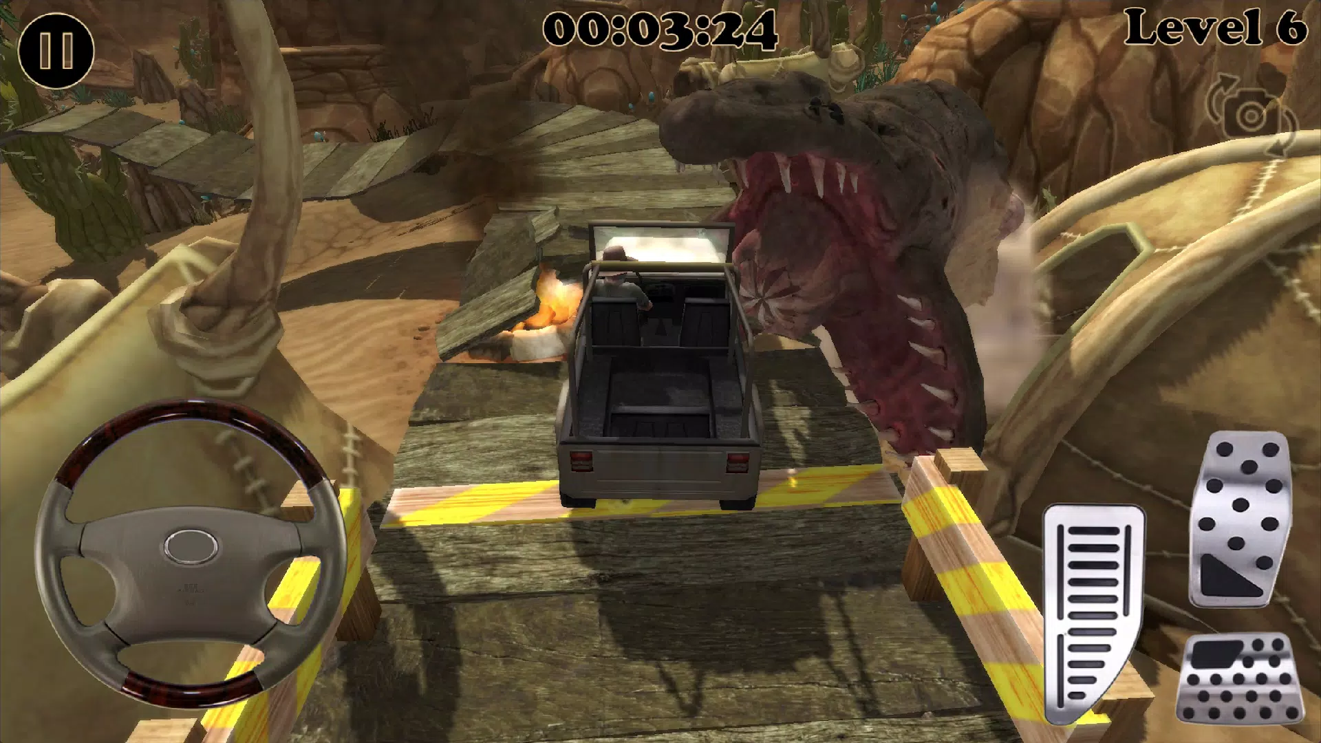Главный вызов игры — найти баланс между скоростью и безопасностью. Медленная езда даёт контроль над машиной, но оставляет вас уязвимым для динозавров. Гонка на полной скорости позволяет оторваться от хищников, но один неудачный прыжок — и вы летите в пропасть.