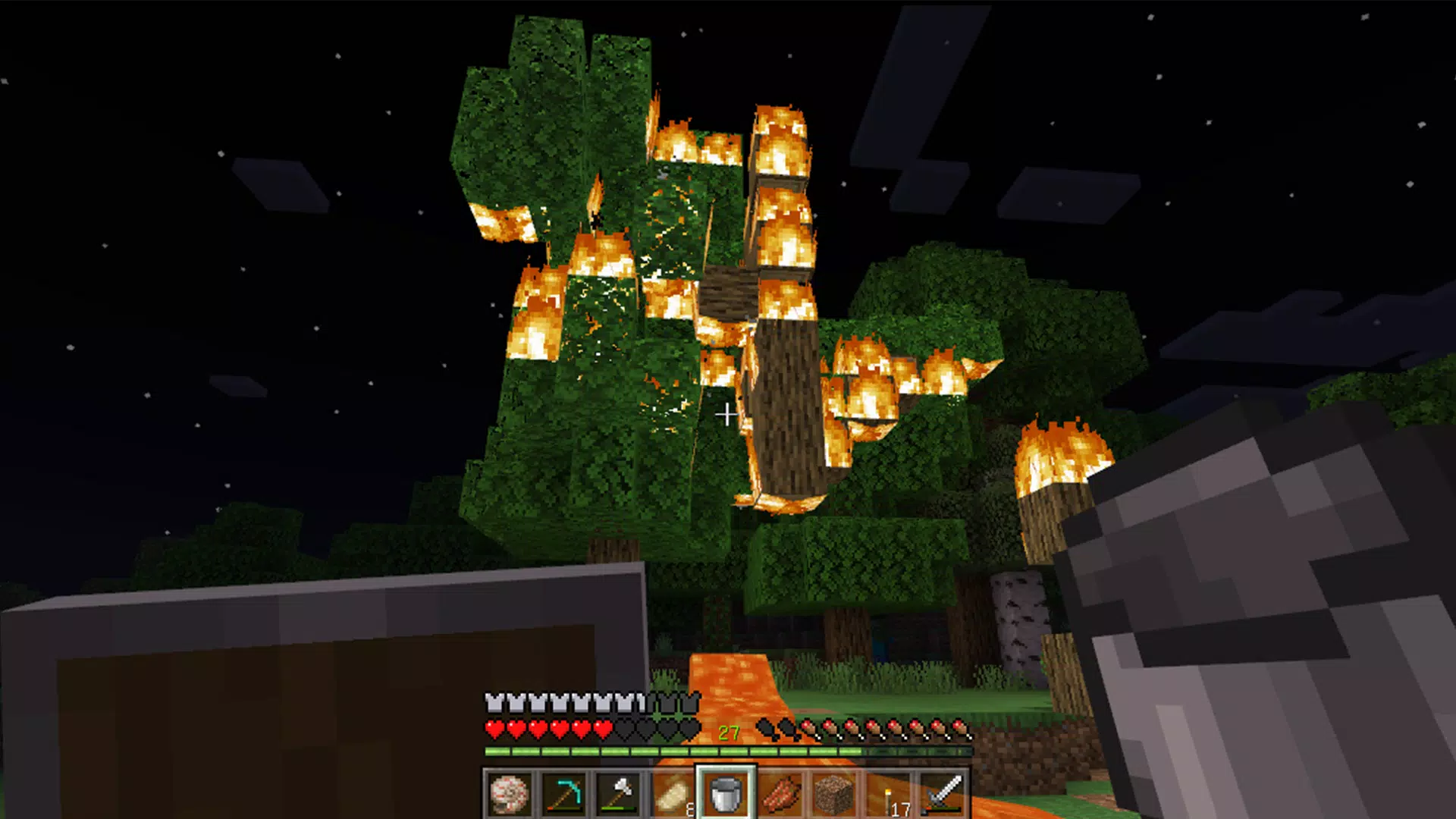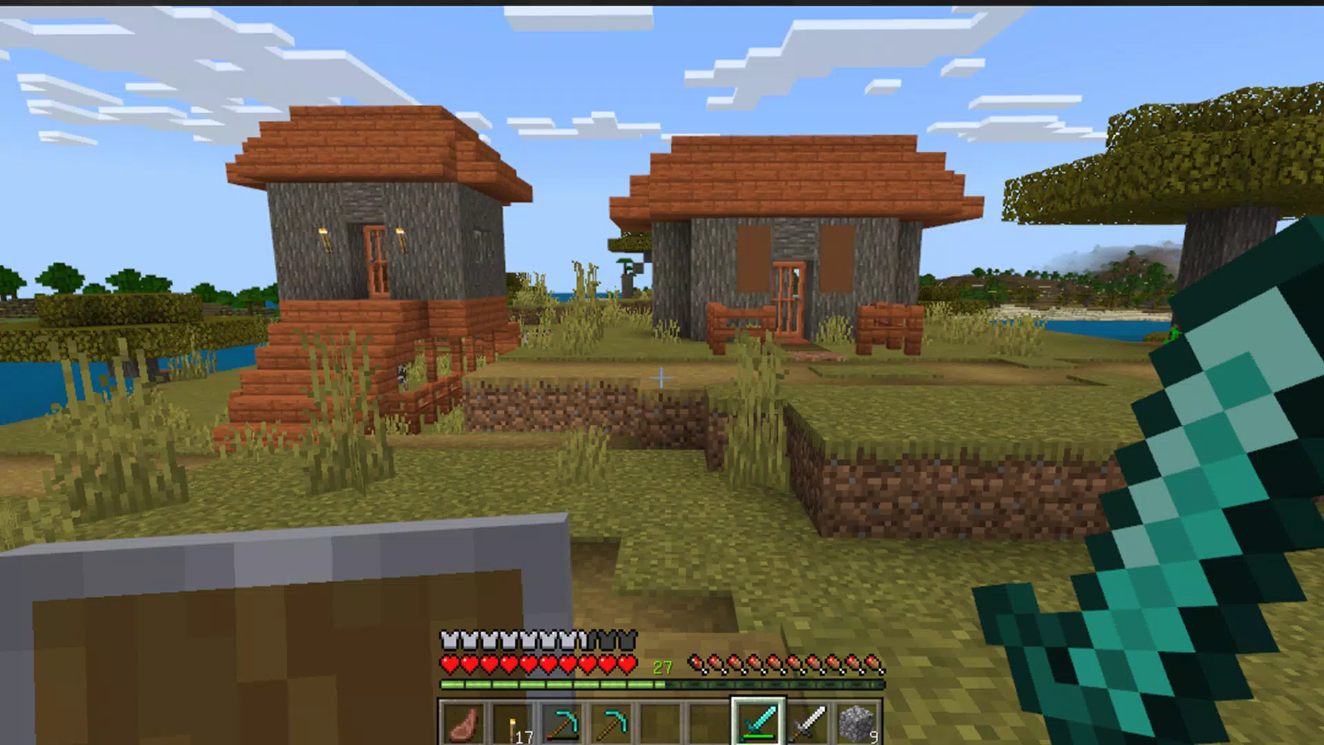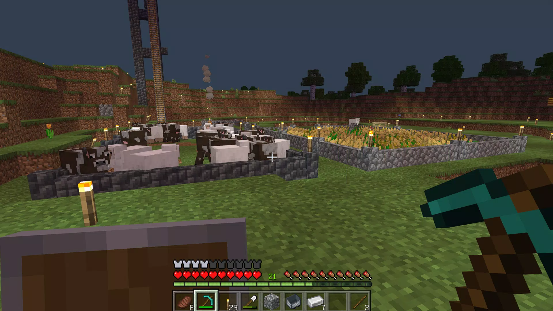 - Режим выживания — следите за здоровьем и сытостью, отбивайтесь от зомби, скелетов и других враждебных мобов. Охотьтесь, занимайтесь фермерством, создавайте оружие и укрепляйте базу, чтобы пережить ночь.