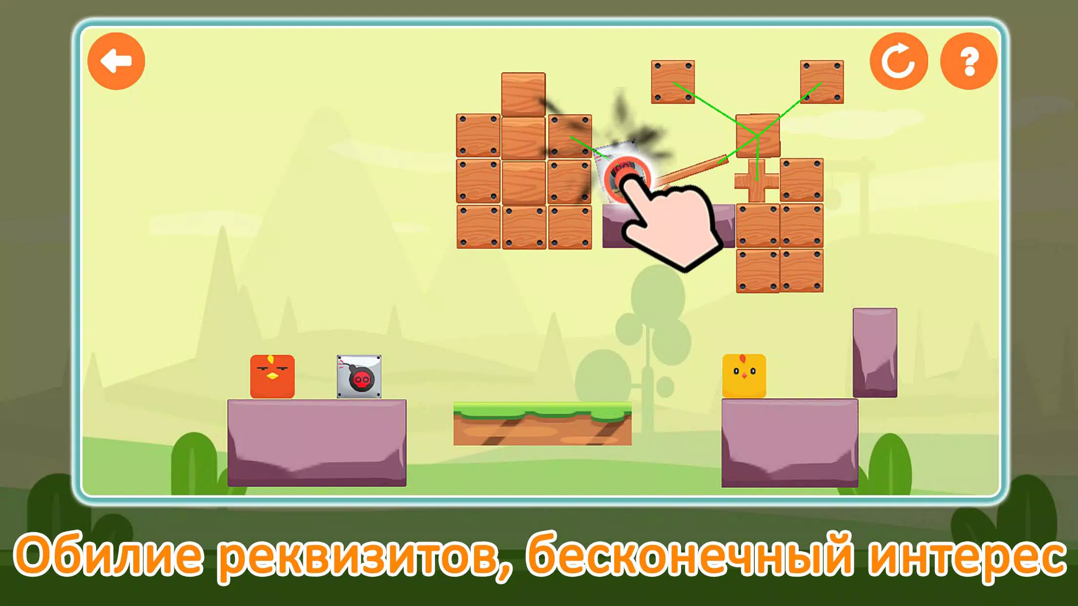 Игра 1: Помогите птице, боящейся высоты, безопасно приземлиться. Используйте деревянные ящики и материалы для создания безопасного пути. Преодолевайте бомбы, скользящие камни, красное лицо, которого птица боится. Игра 2: Стройте крепкую башню, аккуратно складывая блоки в ограниченном пространстве. Гравитация, трение и взаимодействие влияют на результат. Прямоугольные, треугольные, круглые блоки требуют стратегического размещения. Реалистичный физический движок подчиняет объекты законам физики. Регулярные обновления добавляют новые уровни.