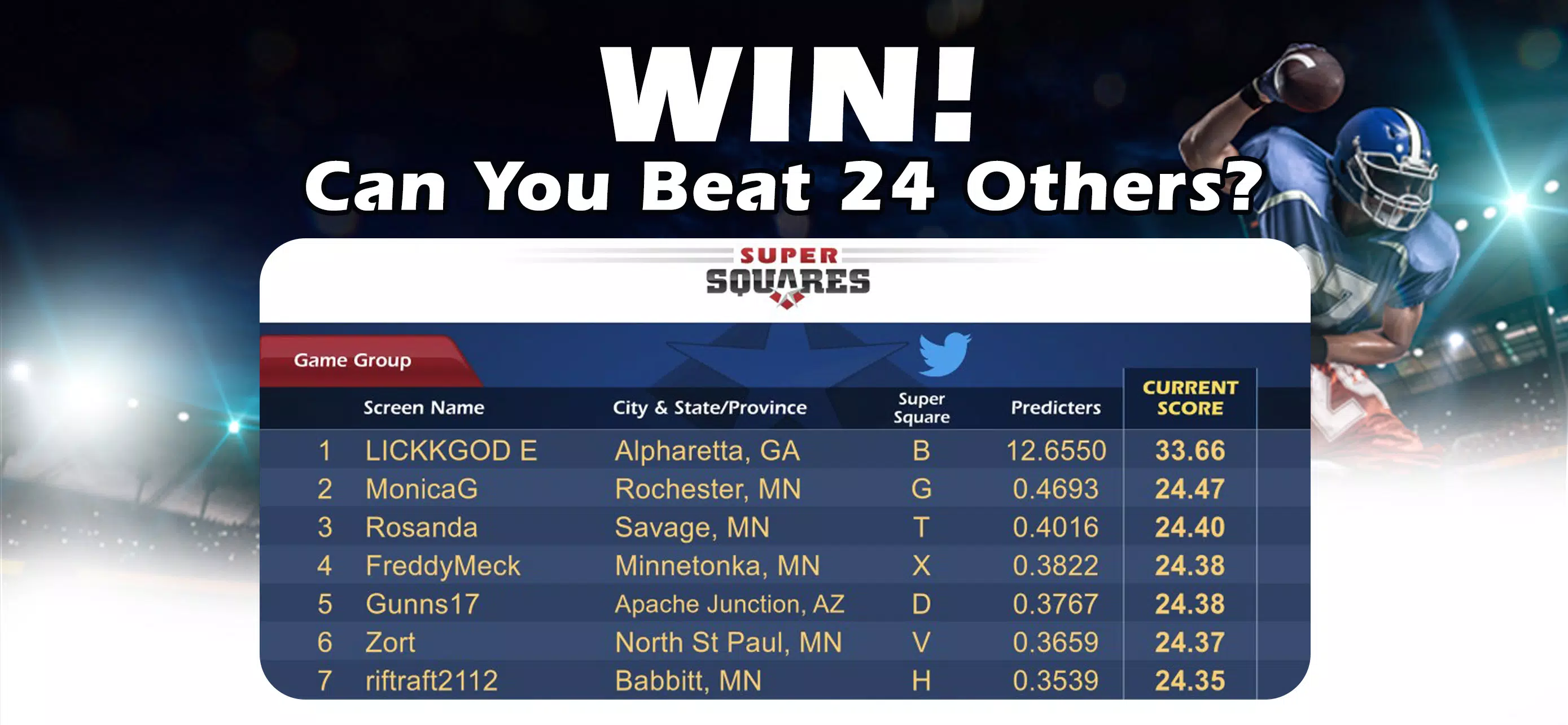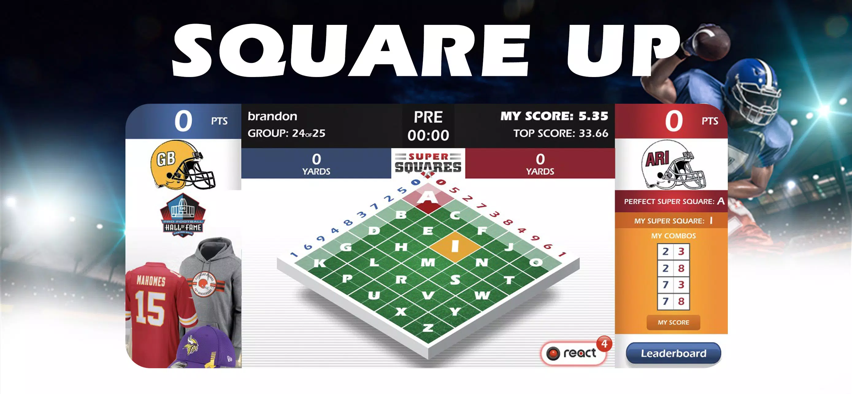Скачайте Super Squares® Live и превратите просмотр любимых спортивных событий в захватывающее соревнование с реальными призами. Станьте следующим победителем самого инновационного спортивного шоу!