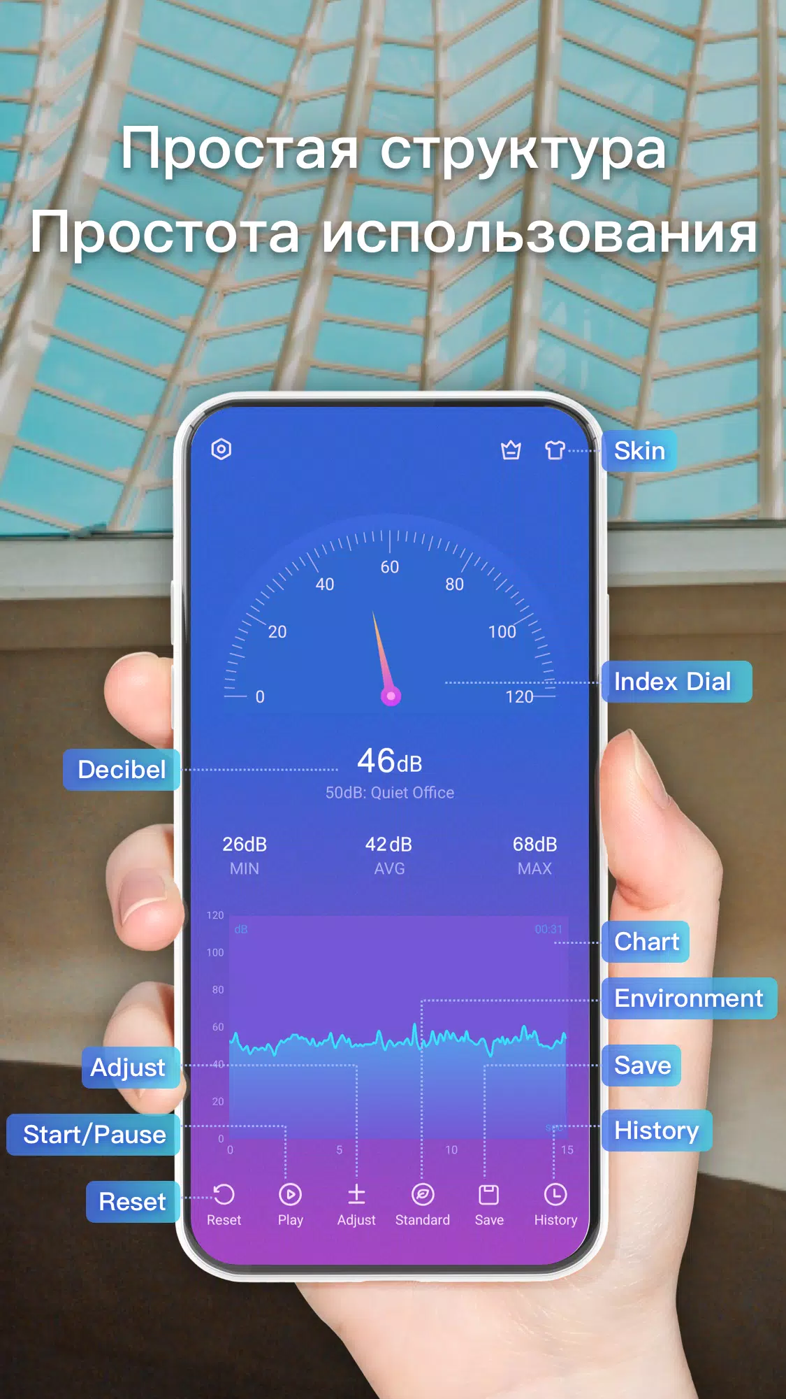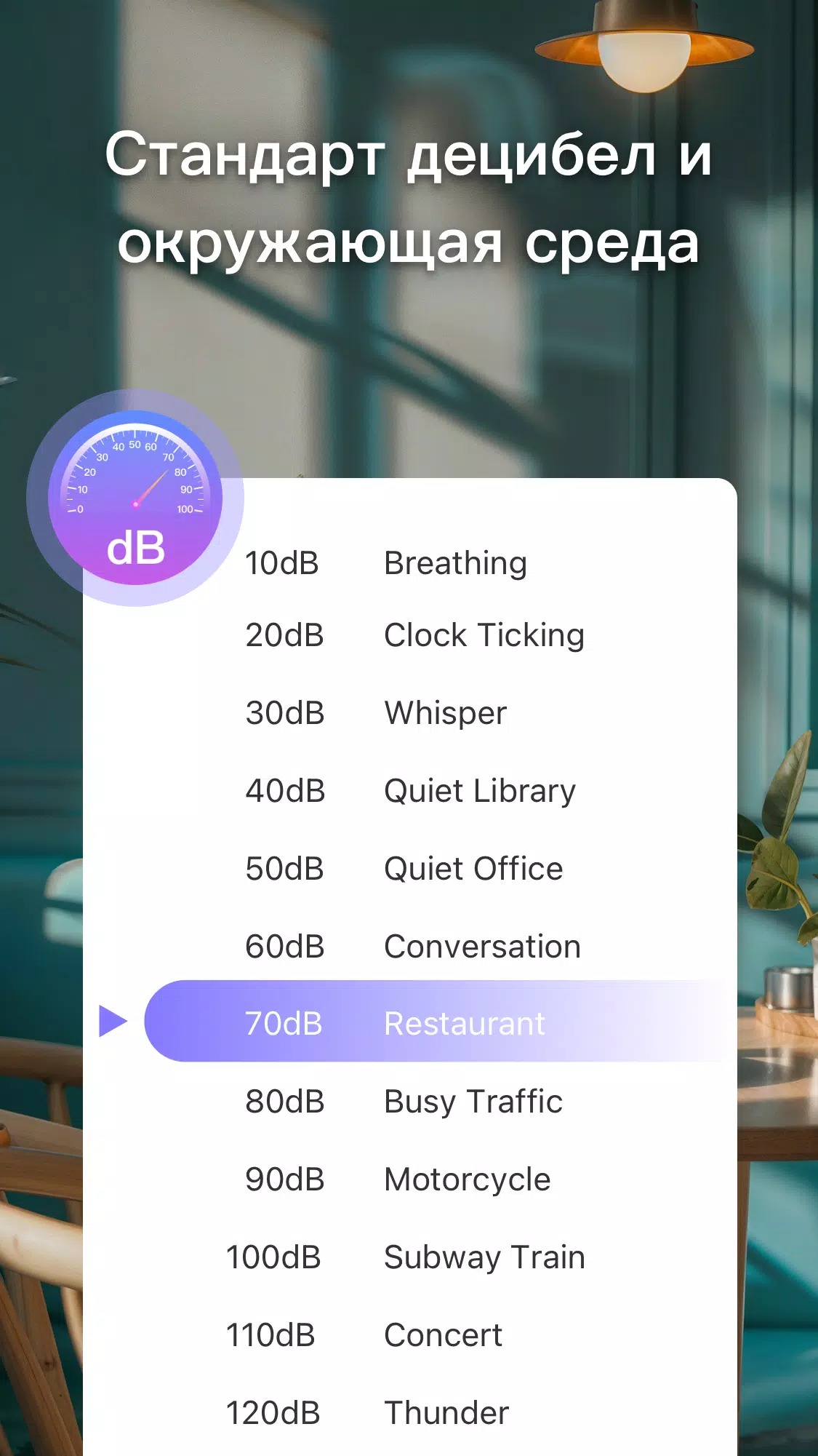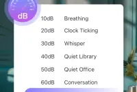 - Справочный модуль: отображение эталонных уровней шума для различных типов окружающей среды, что позволяет быстро понять, насколько громко в помещении или на улице.