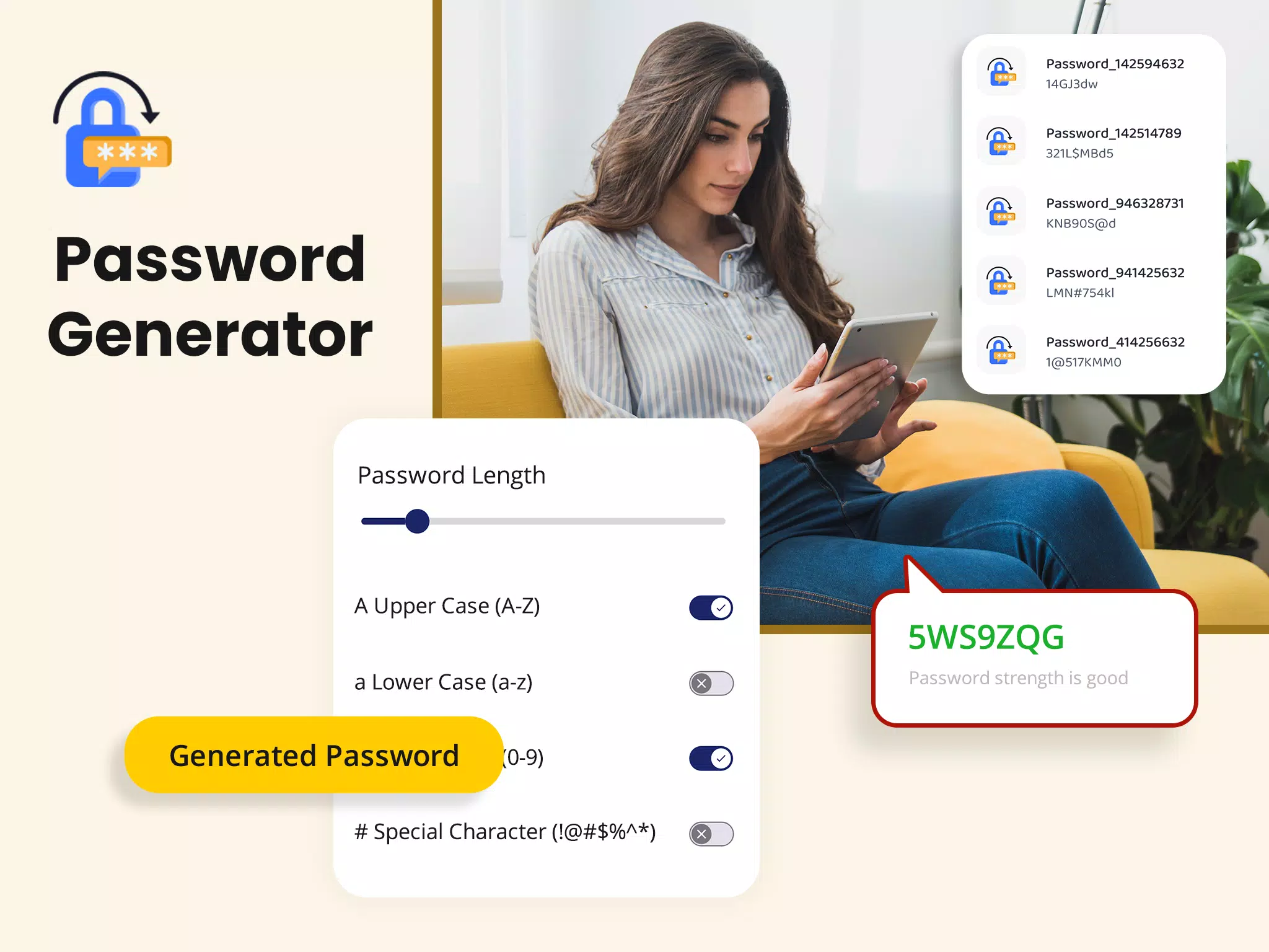 Создавайте надёжные пароли любой сложности. Настраивайте длину (от 4 до 20 символов) и выбирайте типы используемых символов: прописные и строчные буквы, цифры, специальные символы. Сгенерированные пароли можно сразу скопировать для использования.