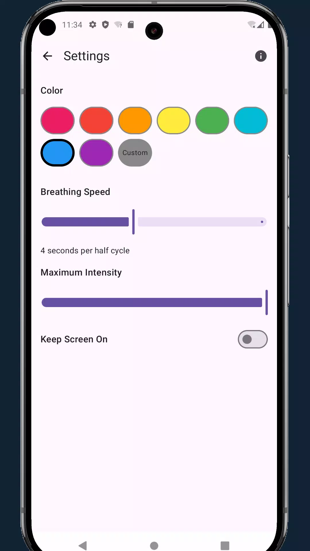 Breathing Light — это минималистичное приложение, которое превращает экран вашего устройства в источник мягкого пульсирующего света. Настраивайте цвета, темп ""дыхания"" и яркость, чтобы создать идеальную атмосферу для расслабления, медитации или украшения пространства.