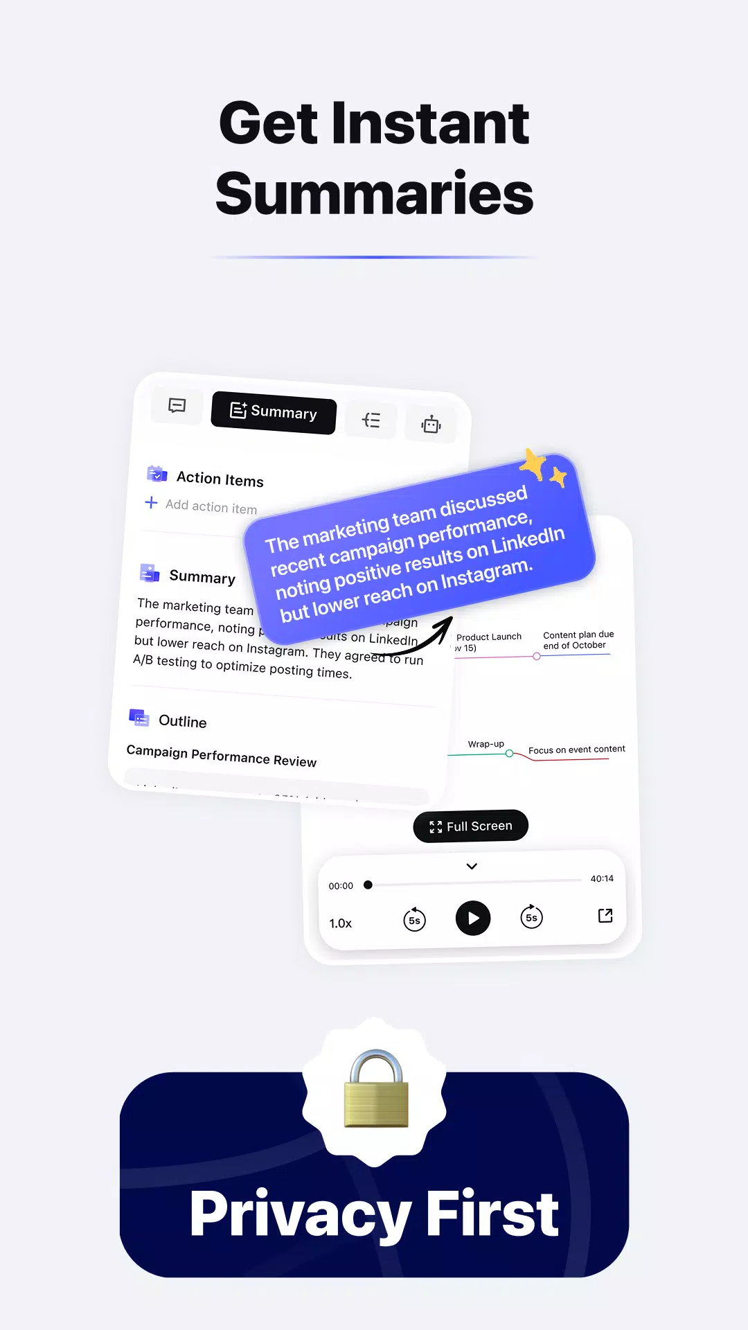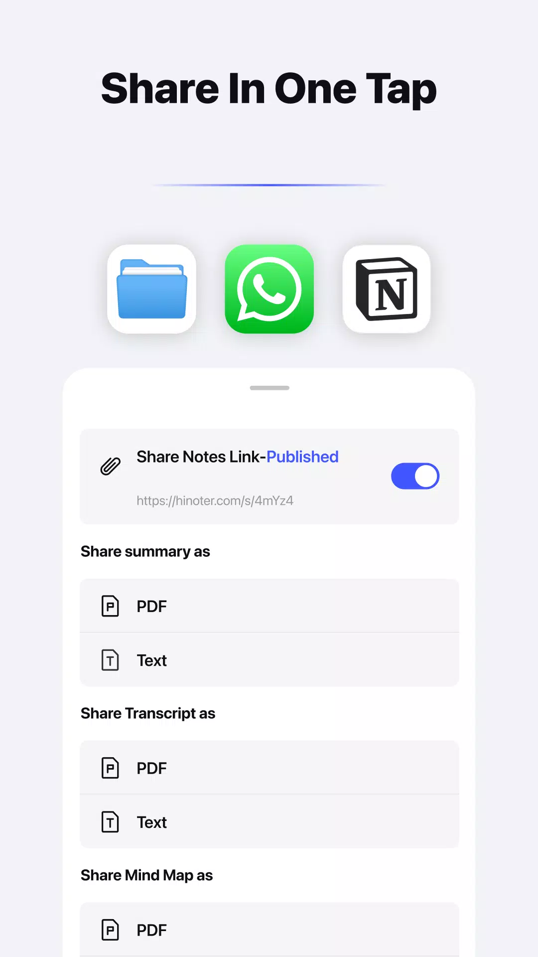 Одним нажатием кнопки HiNoter начинает записывать кристально чистый звук и параллельно в реальном времени создаёт точную текстовую расшифровку с указанием говорящих. На основе этого ИИ-модель мгновенно структурирует информацию, выявляя ключевые моменты.
