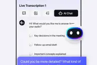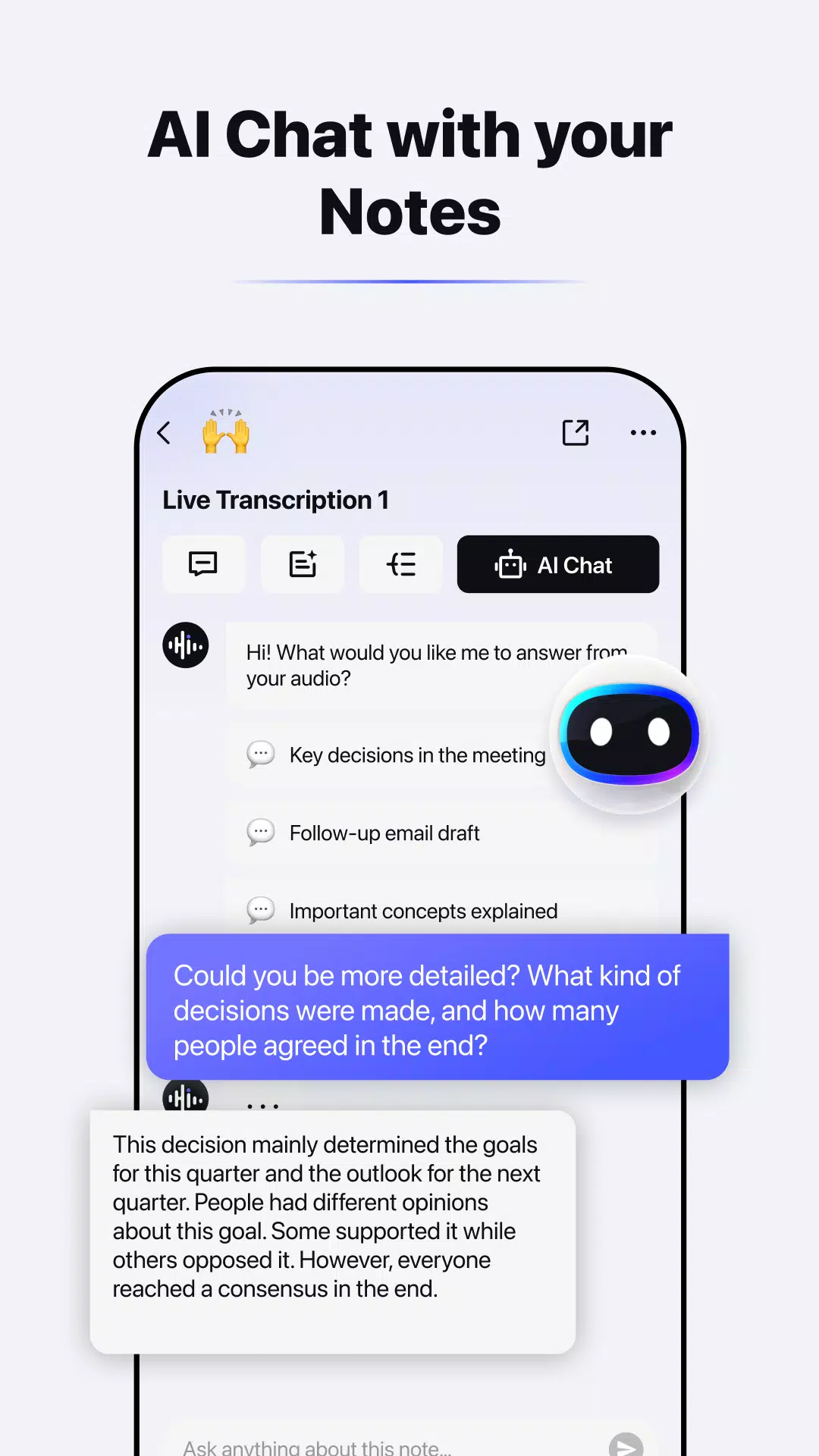 Интерактивный диалог с контентом: Задавайте вопросы о прошедшей встрече прямо в приложении. Например: «Какие были согласованы следующие шаги?» или «Какие аргументы приводились за новый проект?» — и получайте моментальные ответы на основе анализа расшифровки.
