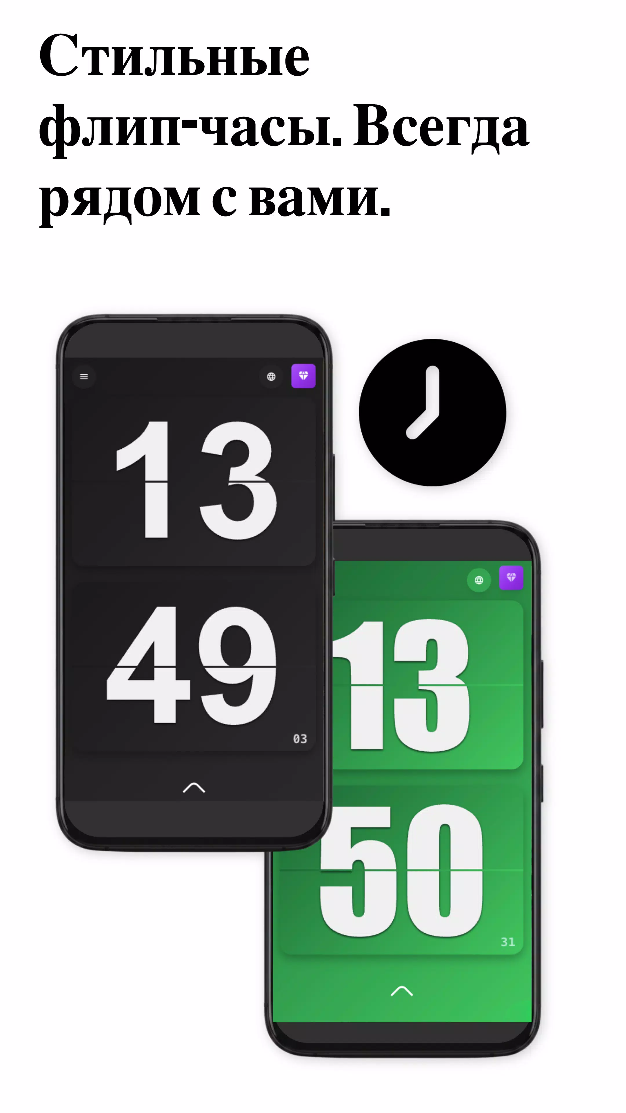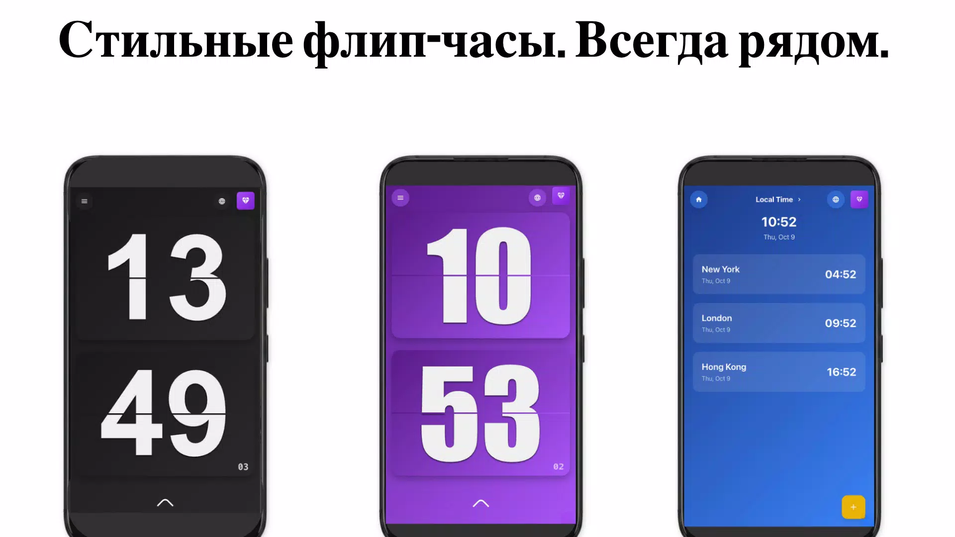 Классический дизайн с анимацией: Наслаждайтесь успокаивающей анимацией перелистывания цифр, переосмысленной для мобильного экрана. Чистый и красивый интерфейс без лишних деталей.